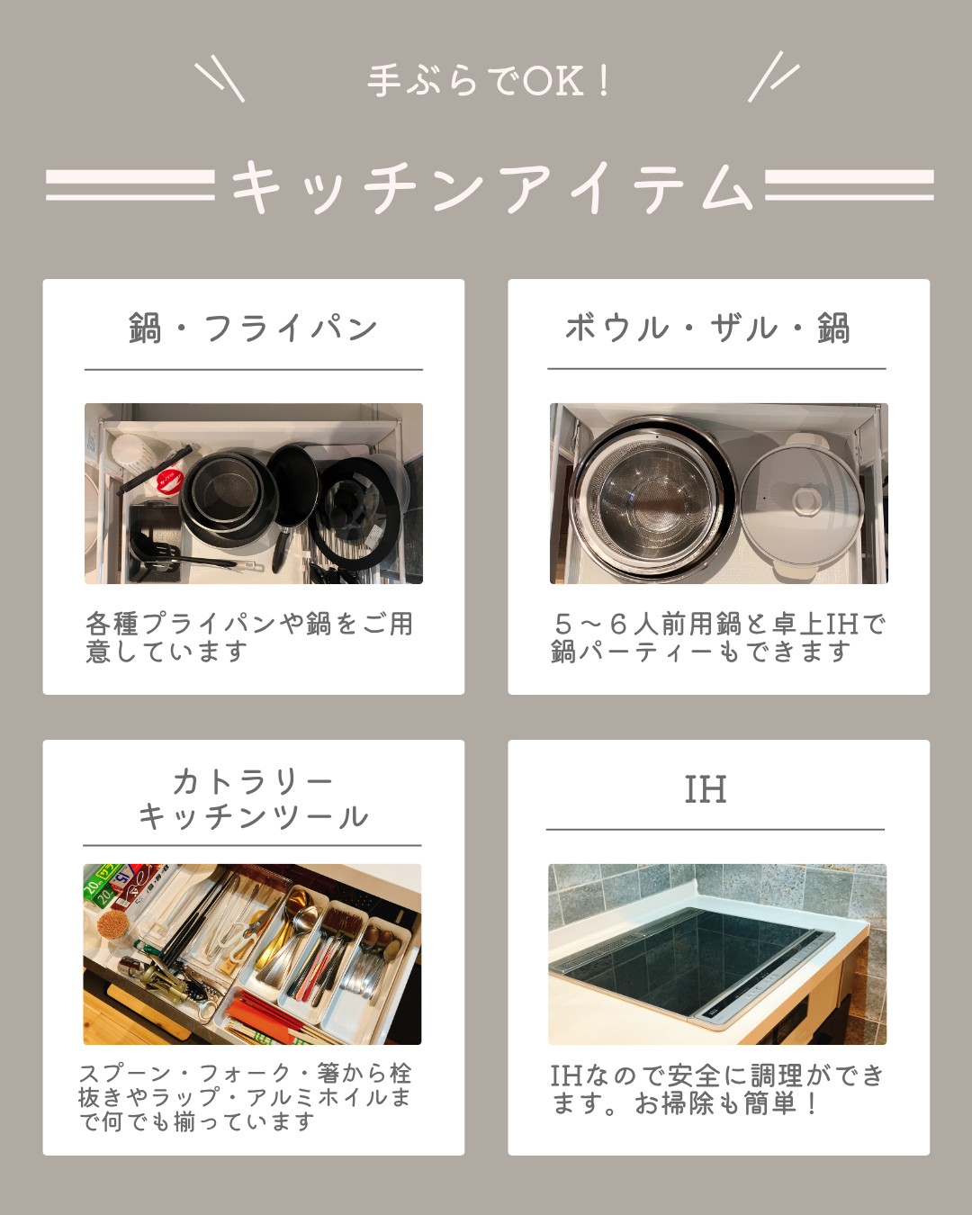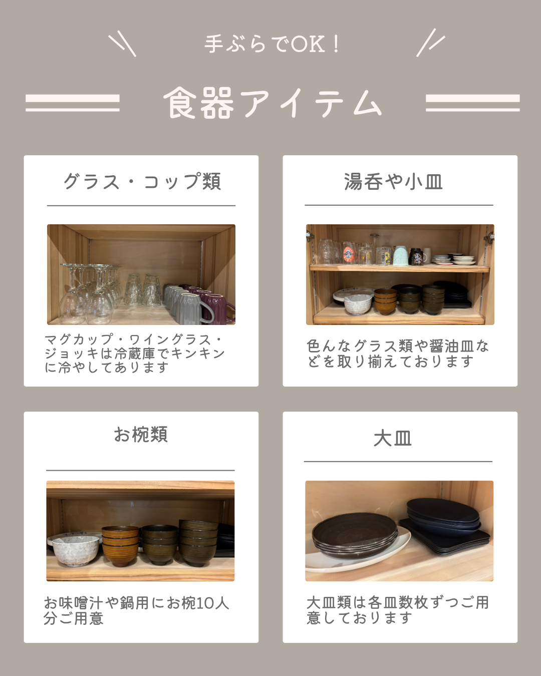 お好きな食材をお持ち頂くだけで、皆さんで調理してお食事を楽しめたり