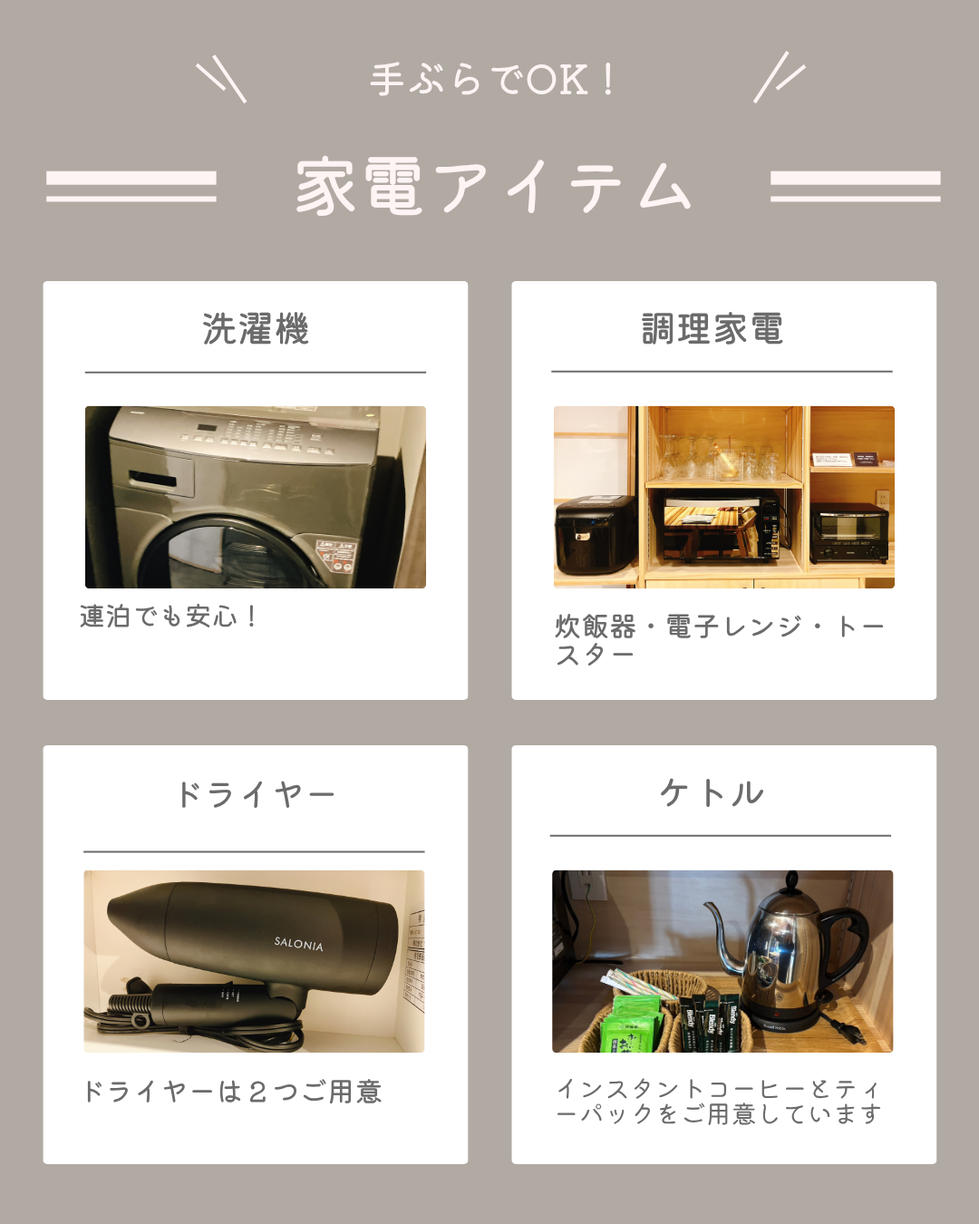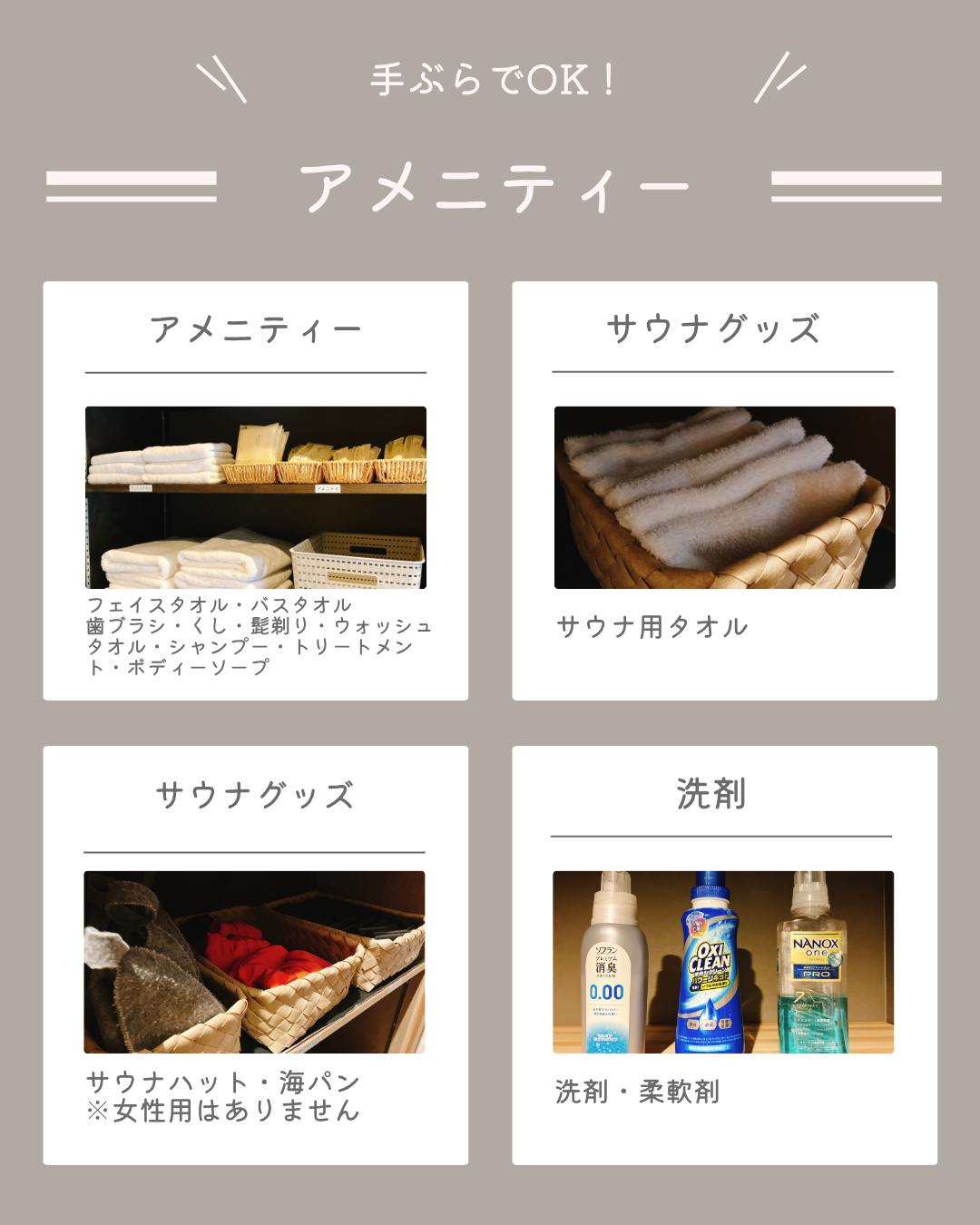 当館ではお客様が快適にお過ごし頂けるように様々なアイテムをご用意しております。